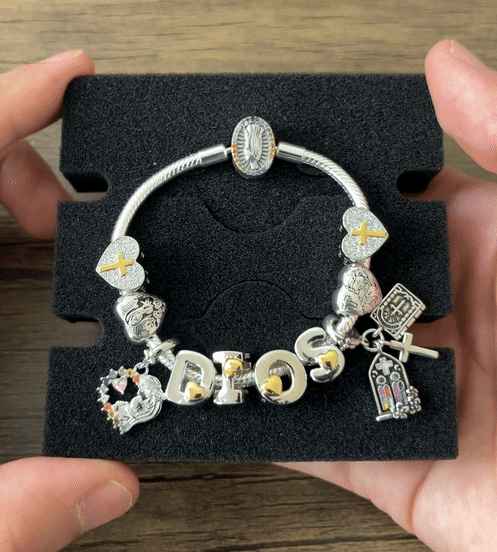 Nuestra pulsera con charms de la Virgen María no es solo un accesorio elegante, es una forma de llevar contigo la Fe, los momentos y recuerdos que más valoras. Cada detalle está cuidadosamente elaborado para que sientas algo especial desde el primer instante.
